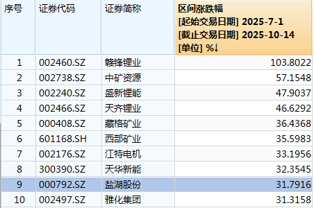 10月14日早盘,盐湖股份涨幅一度超过8%。