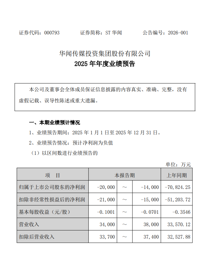 2026年1月31日,华闻传媒投资集团股份有限公司(ST华闻,证券代码:000793)披露2025年年度业绩预告,公司全年归属于上市公司股东的净利润预计亏损1.4亿元至2亿元,虽较上年同期7.08亿元的巨额亏损大幅收窄,但仍未能扭转亏损态势,行业调整与流动性紧缺成为业绩承压的重要原因。
