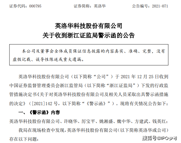 12月26日,英洛华(000795.SZ)发布公告称,该公司及6名高管于12月25日收到浙江证监局警示函,因存在对外担保未履行信息披露义务、募集资金使用和管理不规范、关联交易情况披露不准确3大问题。