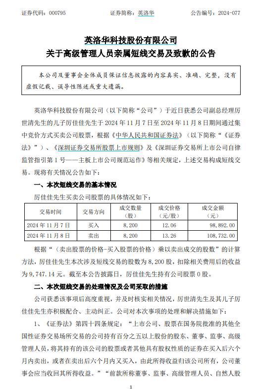 11日盘后,英洛华公告,近日获悉公司副总经理厉世清的儿子厉佳佳于2024年11月7日至2024年11月8日期间通过集中竞价方式买卖公司股票,根据《中华人民共和国证券法》等相关规定,上述交易构成短线交易。