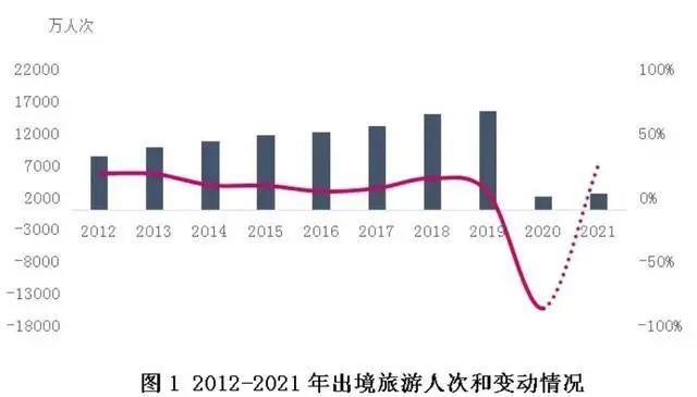 突如其来的疫情则让出境游市场降至冰点,根据《中国出境旅游发展年度报告2021》显示,2020年至2021年的中国出境旅游总体处于停滞状态,依然在底部盘整。2020年全年出境旅游人数为2033.4万人次,同比减少86.9%。2021年,预测出境旅游人数为2562万人次,与2019年相比同比恢复17%。