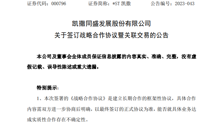 就在同一天,*ST凯撒与*ST海投(000616)均披露公告,宣布双方签署《战略合作协议》,将围绕各自行业领域的优势资源,在康养旅居、医养服务等方面相互赋能,资源共享,促成共同发展,本次合作构成关联交易。