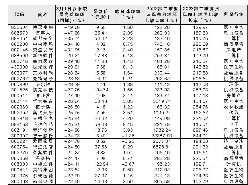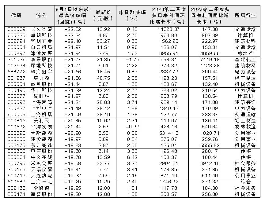 本周五市场出现反弹,部分超跌股表现抢眼。《大众证券报》编辑以8月以来股价较最高价回撤超过19%、今年第二季度归母净利同比增速和环比增速均大于100%为标准,筛选出56只超跌股供投资者参考。