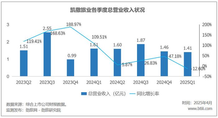 根据报告,凯撒旅业2025年一季度营业收入1.41亿元,上年同期为1.61亿元,同比下降12.60%。2024年营业收入6.53亿元,上年同期为5.82亿元,同比增长12.25%。