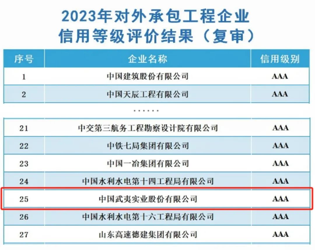 近日,中国对外承包工程商会公布2023年企业信用等级评价结果,中国武夷顺利通过复审,连续6年获评对外承包工程企业最高信用等级AAA级企业。