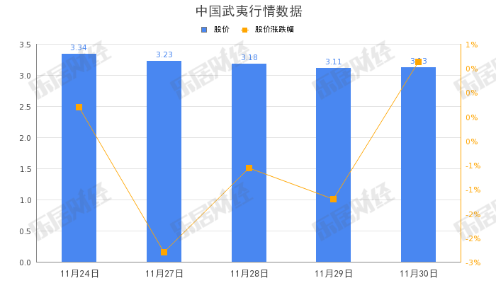 截至11月30日,中国武夷(000797.SZ)股价收盘报3.11元,涨0.64%,总市值49.16亿元。