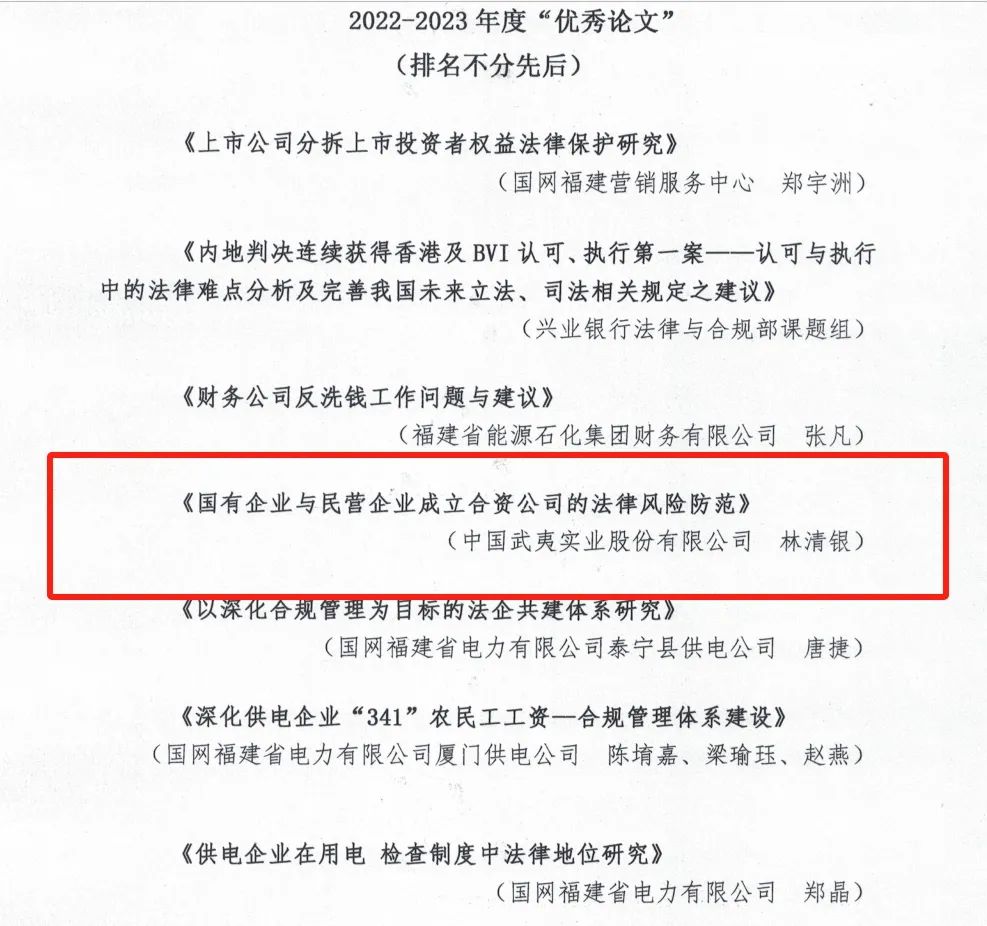 同时,公司法务合规部林清银同志的论文《国有企业与民营企业成立合资公司的法律风险防范》获评“2022-2023年度优秀论文”。