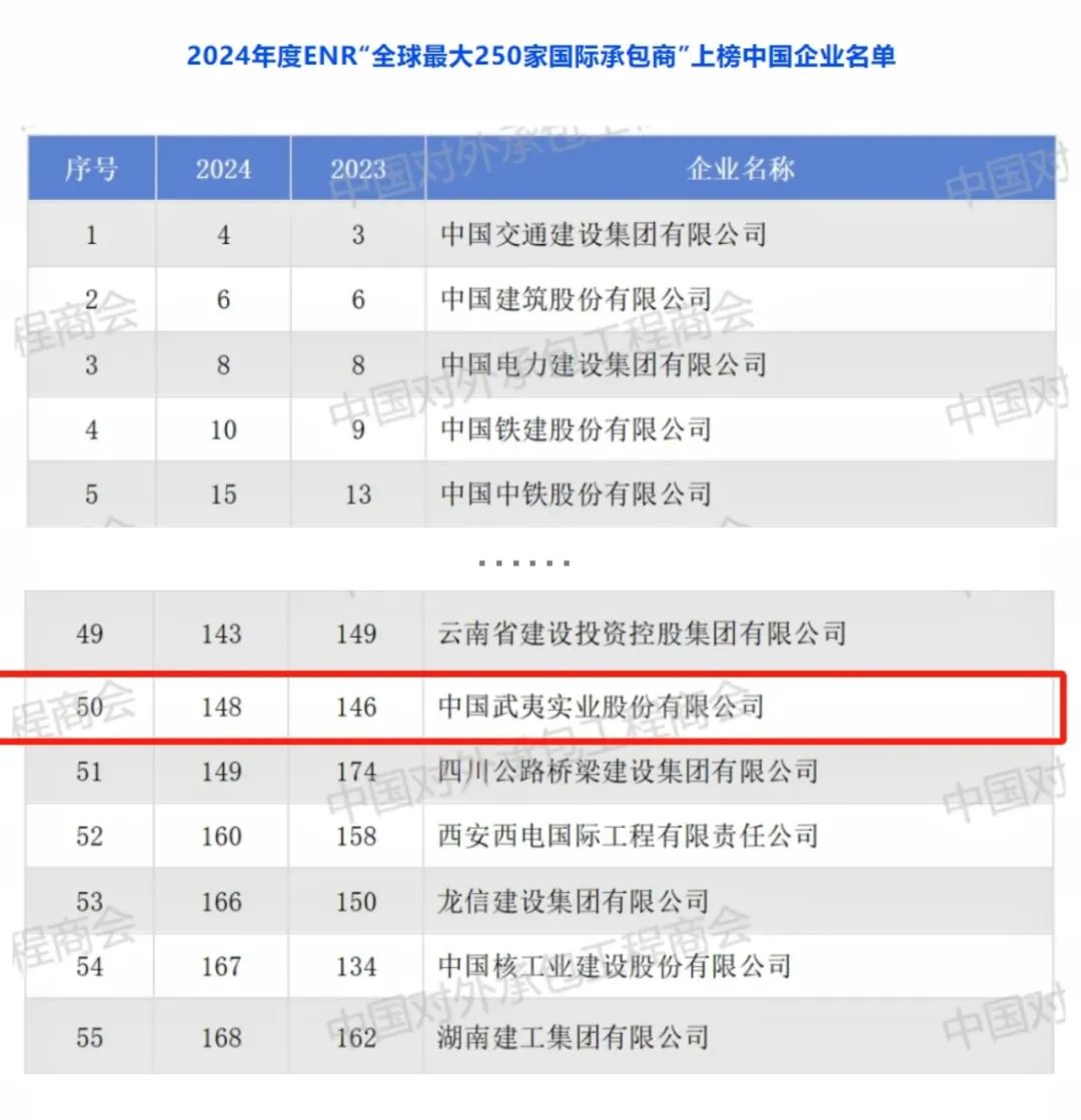 近日,2024年度美国《工程新闻纪录(ENR)》“国际承包商250强”榜单发布。中国武夷实业股份有限公司再次入选,位列榜单第148位,在入围的81家中国企业中居第50位。这也是其自1995年以来蝉联该榜单。