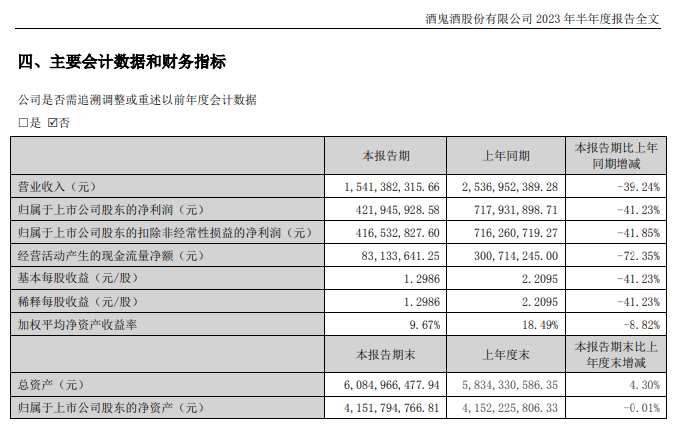 近日,酒鬼酒(000799.SZ)发布了半年报,上半年实现营业收入15.41亿元,同比下降39.24%;净利润4.22亿元,同比下降41.23%;经营活动产生的现金流量净额大降72.35%,只有0.83亿元。这是酒鬼酒近7年来中报业绩首降,且降幅巨大,是2023年上半年业绩增长最差劲的上市白酒企业。