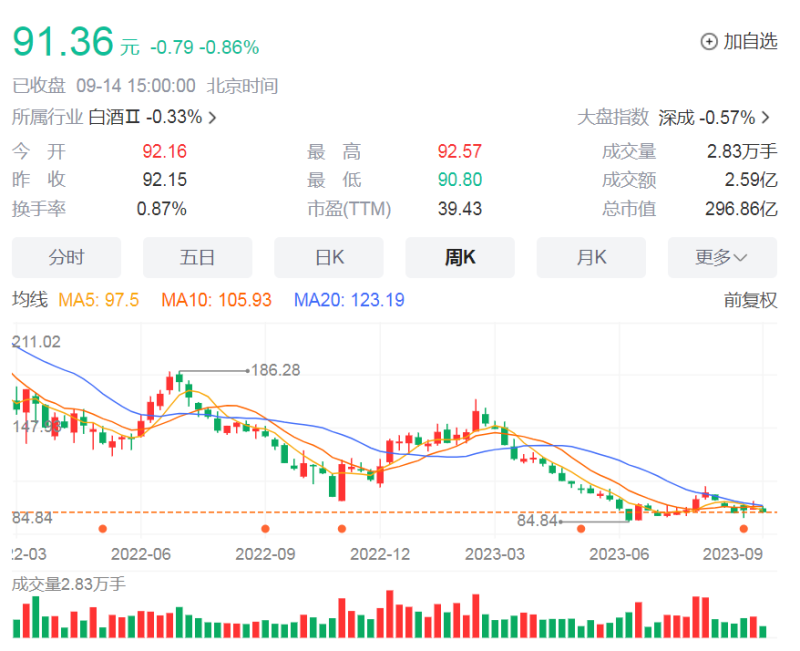 同样的趋势也反映在了资本市场上。9月14日酒鬼酒收盘价91.36元每股,相比2021年的高点,已经跌去65%以上。