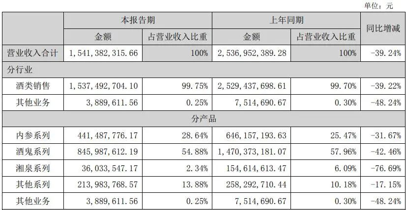 根据半年报,2023年内参系列实现营业收入4.41亿元,较上年同期降低31.67%;酒鬼系列实现营业收入8.46亿元,较上年同期降低42.46%;湘泉系列实现营业收入3603.35万元,较上年同期降低了76.69%;甚至连“其他系列”、“其他业务”也都出现了下降,分别下降17.15%和48.24%。