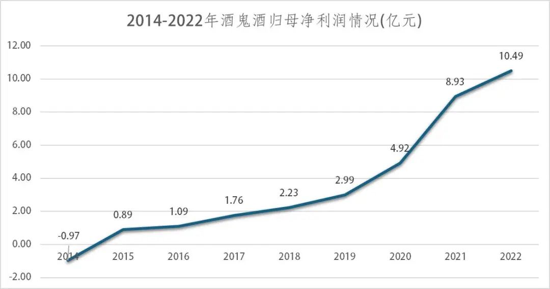 2014年,酒鬼酒归母净利润出现亏损,为-0.97亿元,次年实现盈利,随后持续增长,至2022年酒鬼酒归母净利润已达到10.49亿元,利润端规模扩大也超过10倍。
