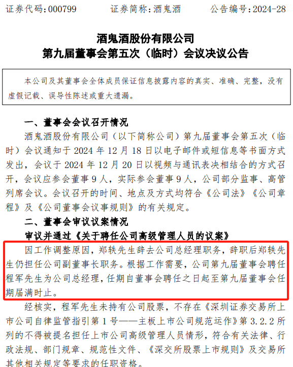 上周末,酒鬼酒发布公告,因工作调整原因,郑轶辞去公司总经理职务,辞职后仍担任公司副董事长职务。