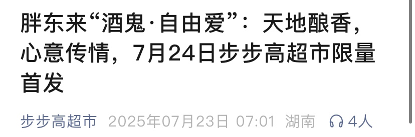 据步步高超市官方公众号等报道,酒鬼酒与胖东来联名推出的"酒鬼·自由爱"产品于7月24日在步步高超市限量首发,不出意外的是,该产品由于前期宣传所带来的流量加持,发布后迅速售罄,与洋河59元光瓶酒相似,市场反应同样热烈。