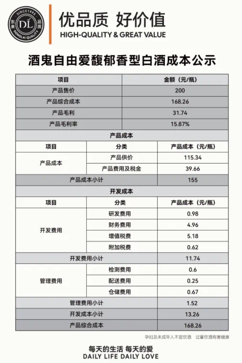 根据步步高超市公示的成本明细,该产品在超市端的成本构成或存在双重计算情况,一方面包含115.34元的产品供价和39.66元的产品费用及税金,这理应已涵盖酒鬼酒公司的全部生产成本;另一方面步步高超市却又单独列支包含管理费用的13.26元开发成本,这一异常成本结构情况或需要进一步解释说明,否则其披露的毛利率数据可信度存疑。