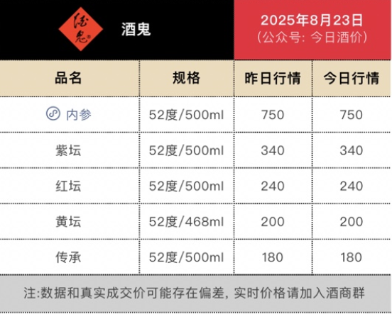 2025年初,内参酒的批价为720元,而酒鬼系列稳定在180-340元的价格区间。从近期数据来看,截至2025年8月24日,内参批价小幅上升至750元;酒鬼系列中,紫坛、红坛和黄坛的批价分别维持在340元、240元和200元。值得注意的是,对比2024年初的批价数据,彼时内参850元、紫坛480元、红坛420元,当前各产品批价仍均有不同程度的下调。