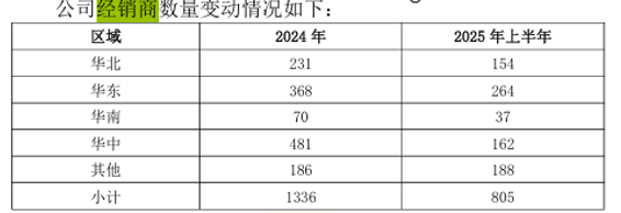 截至2025年上半年,公司经销商数量已降至805家,较2024年末的1336家净减少531家。这一下滑延续了此前渠道收缩的趋势——2024年内经销商数量已从1774家减少至1336家,净流失438家。