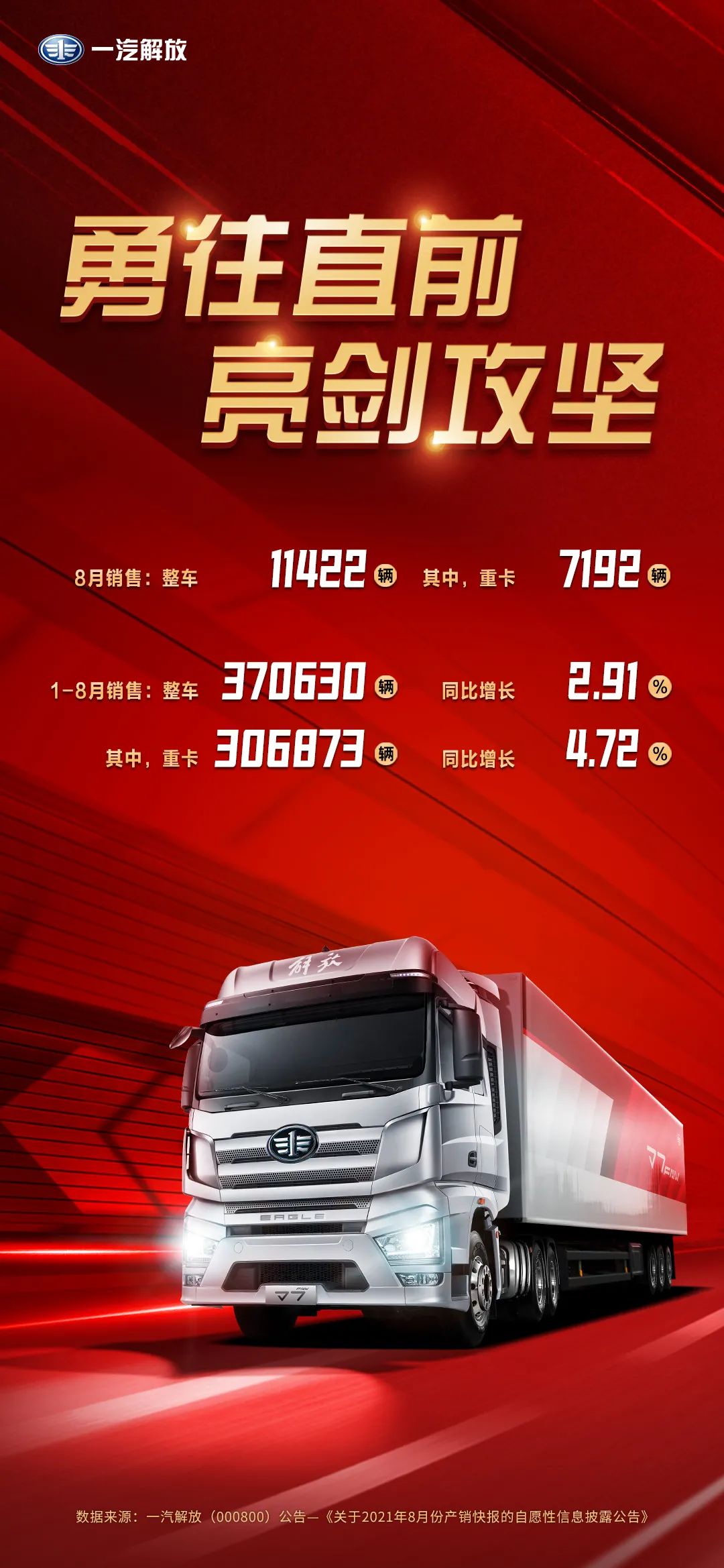 中国商用汽车网讯据一汽解放(000800)发布2021年8月份产销快报数据情况显示,一汽解放顺应客观市场形势,充分调动行业和企业的积极性。8月,一汽解放整车销售11422辆,其中重卡7192辆;1-8月,实现累计销售370630辆,同比增长2.91%,其中重卡销量306873辆,同比增长4.72%。