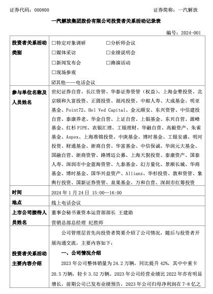 一汽解放集团股份有限公司(以下简称“一汽解放”或“公司”)1月25日晚间发布公告称,公司于1月24日与多家机构投资者进行了电话会议。在会议中,一汽解放透露,2023年公司整体销量为24.2万辆,同比提升42%,其中中重卡20.5万辆,轻卡3.52万辆。2023年公司经营业绩比2022年亦有明显增长,前期公司已发布业绩预告,2023年公司归母净利润在7-8亿元之间,相比去年同期业绩大幅改善。