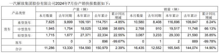 一汽解放8月8日公告,7月销量16435辆;1-7月销量165545辆,同比增长14.90%。