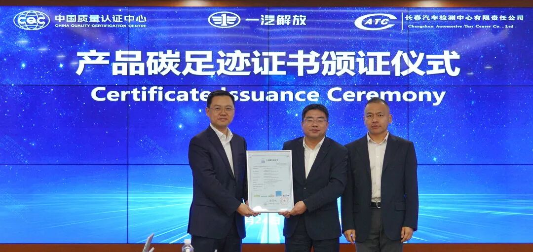 12月24日,中国质量认证中心首张商用车产品碳足迹证书颁证仪式在长春举行。中国质量认证中心总经理助理王欢喜,一汽解放党委委员、副总经理兼商用车开发院院长、党委书记王建宇,长春汽车检测中心总经理、党委副书记刘英杰出席仪式。该证书是一汽解放首张产品碳足迹证书,也是中国质量认证中心颁发的首张商用车产品碳足迹证书。