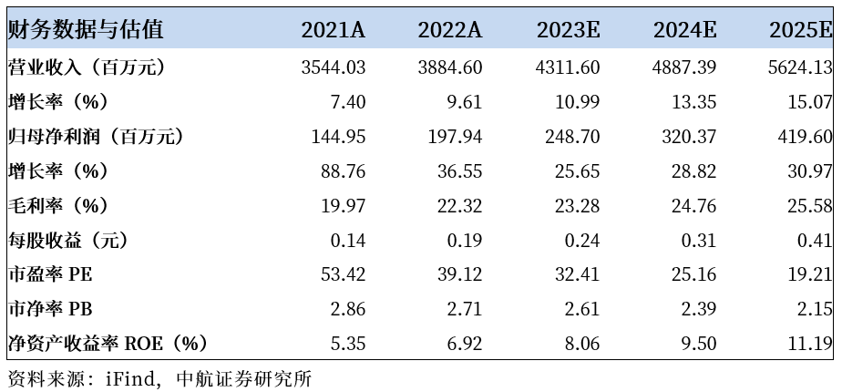 我们预计公司2023-2025年的营业收入分别为43.12亿、48.87亿元和56.24亿元,归母净利润分别为2.49亿元、3.20亿元和4.20亿元,EPS分别为0.24元、0.31元和0.41元,我们给予“买入”评级,目标价8.50元,对应2023-2025年预测EPS的35倍、27倍及21倍PE。