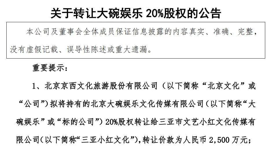 公告显示,北京京西文化旅游股份有限公司(以下简称“北京文化”)拟将持有的北京大碗娱乐文化传媒有限公司(以下简称“大碗娱乐”)20%的股权,以2500万元转让给三亚市文艺小红文化传媒有限公司(以下简称“三亚小红文化”)。