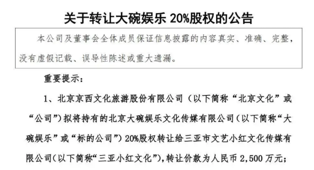 日前,有媒体报道北京文化以2500W的价格将大碗娱乐的20%的股权转让给了三亚小红文化,很明显郑爽被禁对北京文化造成了不小的伤害,因为《只问今生恋沧溟》的幕后主要投资方就是北京文化,而且北京文化目前现在也是泥菩萨过河,自身难保。