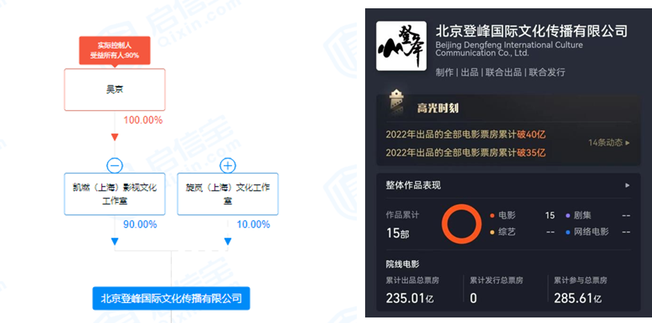 登峰国际背后第一大股东为凯燃(上海)影视文化工作室,持股比例为90%,而该工作室背后的股东为吴京,100%持股。作为吴京的关联公司,登峰国际截至目前,累计参与的影片多达15部,其中累计出品影片的总票房高达235亿元。
