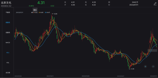 截至7月12日收盘,北京文化收于4.18元/股,今年以来股价已累计下跌15%,较历史高点已跌去近九成,总市值为29.92亿元。