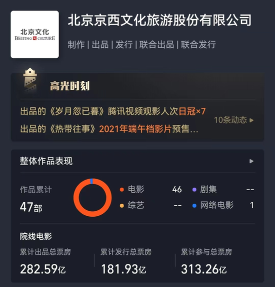 而灯塔平台数据显示,2014年以来,北京文化参与制作、出品、发行的主要影片共46部。其中高产年份2018年、2019年产出的电影有21部。