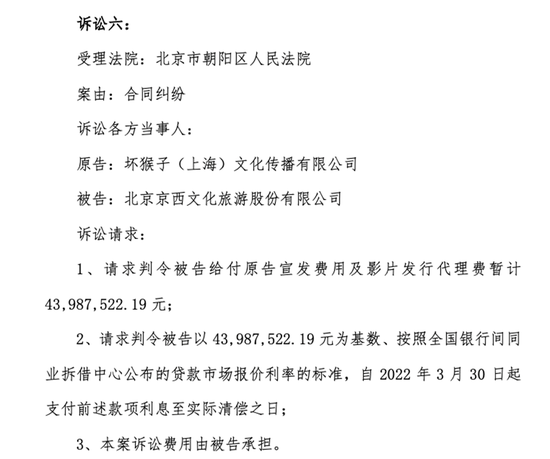 此外,真乐道起诉要求北京文化支付结算款项及利息合计约2780万元;国影纵横提起两起诉讼,合计要求北京文化支付投资收益及发行收益、利息及违约金等超过1180万元。