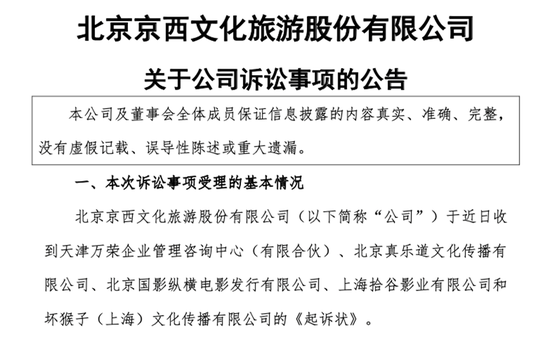 公告显示,因影片收益款纠纷等事项,天津万荣企业管理咨询中心(有限合伙)、北京真乐道文化传播有限公司、北京国影纵横电影发行有限公司、上海拾谷影业有限公司和坏猴子(上海)文化传播有限公司等5家公司分别起诉了北京文化。