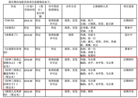 2017年的公告显示,北京文化原拟在《封神》系列三部影片中投资不高于13亿元。其中,《封神一》暂定2020年暑期公映,《封神二》暂定2021年暑期公映,《封神三》暂定2022年暑期公映。