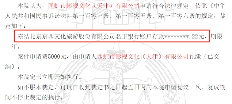北京市朝阳区人民法院认为,西虹市影视文化(天津)有限公司申请符合法律规定,依照《中华人民共和国民事诉讼法》第一百零三条、第一百零五条、第一百零六条的规定,裁定如下:冻结北京京西文化旅游股份有限公司名下银行账户存款********.22元,期限一年。