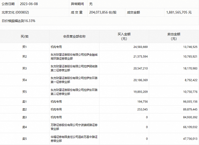 6月8日,北京文化今日跌0.88%,龙虎榜数据显示,上榜营业部席位全天成交5.54亿元,占当日总成交金额比例为29.45%。其中,买入金额为1.07亿元,卖出金额为4.47亿元,合计净卖出3.4亿元。