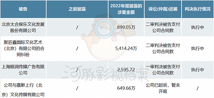 不过几个月后的2022年年报显示,这些诉讼大多已经解决。比如,10月披露的北京优酷、嘲风影业和橙子映像为原告的四起诉讼都显示还未开庭,在年报中都已经显示为调解结案或和解撤诉。