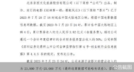 7月24日,北京文化票房公告称,《封神第一部》在中国大陆地区上映4日,累计票房收入约为3.82亿元(含服务费),超过公司最近一个会计年度经审计的合并财务报表营业收入的50%,来源于该影片的营业收入约为2.3亿-2.5亿元。