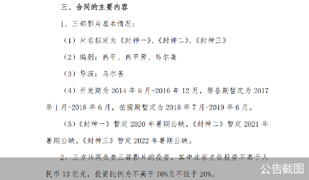 北京文化曾于2017年披露重大合同公告,与东阳长生天影视制作有限公司、世纪长生天影业(北京)有限公司签署《电影项目合作框架协议书》,三方就电影项目《封神》三部影片开展合作。三方共同负责三部影片的投资,其中北京文化投资不高于13亿元,投资比例为不高于70%且不低于20%。