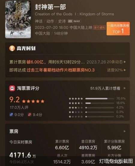国产片扎堆的暑期档,竞争激烈,但《封神第一部》却轻而易举地突出重围。据灯塔专业版,该片上映8天,票房达6.6亿元,观影总人次超1514万。