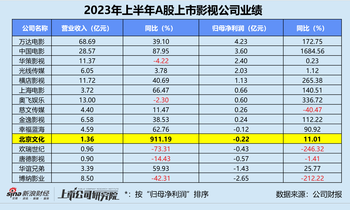 8月25日,北京文化公布2023年上半年业绩报告。财报数据显示,报告期内公司实现总营收1.36亿元,与2022年同期相比翻了近10倍。归母净亏损录得2238.83万元,虽然同比收窄11.01%,但仍未彻底摆脱亏损阴影。2019-2022年期间,北京文化接连曝出财务造假、高层内斗、签订“阴阳合同”、被多家影视公司联手追债等丑闻,4年累计亏损超32亿元。