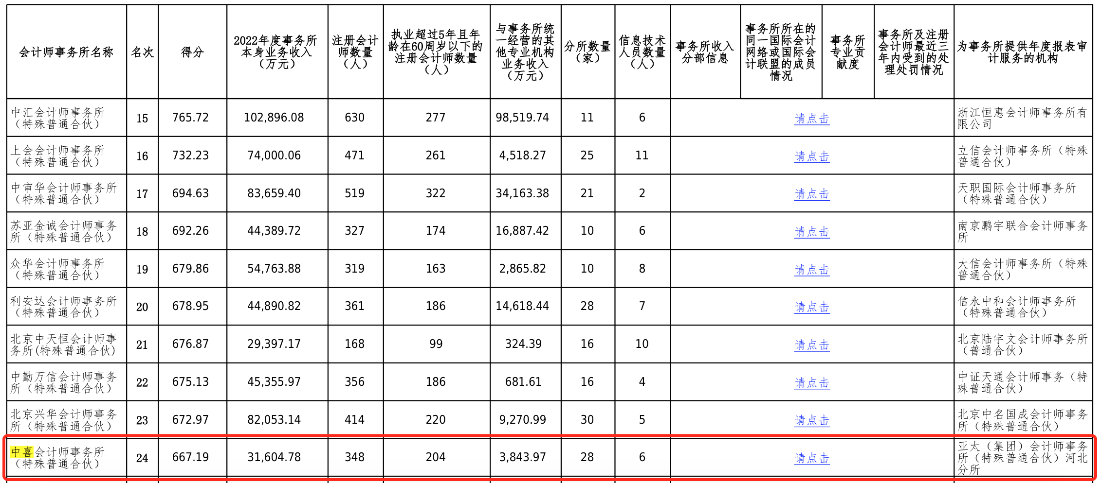 浏览中国注册会计师协会网站,2023年10月18日披露的《2022年会计师事务所综合评价百家排名信息》中,中喜所排24,2022年业务收入3.16亿元,注册会计师数量为348人,分所28家。