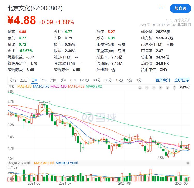 8月29日,北京文化(000802)发布2024年半年报,公司营业收入为771.76万元,同比下降94.31%;归母净利润为-3275.21万元,同比下降46.29%;扣非归母净利润为-3605.44万元,同比下降51.31%。从2019年至今持续亏损的北京文化,最近5年半累计亏损近35.8亿元。