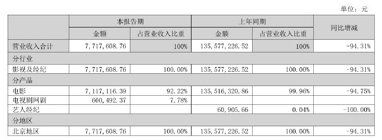 半年报显示,北京文化主营业务为影视文化业务,包含电影、电视剧网剧、艺人经纪、文化旅游等业务板块。在电影、电视剧网剧方面,主要通过投资、制作、营销、发行、销售影视项目的方式进行运营。