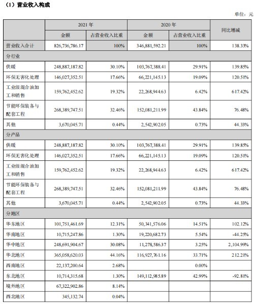 根据北清环能2021年年报,全年营业收入8.27亿元,其中“环保无害化处理”与“工业级混合油加工和销售”两类产品分别贡献了1.46亿元和1.60亿元的营业收入,所占比例分别为17.66%和19.32%;另外,“节能环保装备与配套工作”收入2.68亿元,占比32.46%,为“分产品”构成情况中所占比例最大;“供暖”收入2.49亿元,占30.10%。