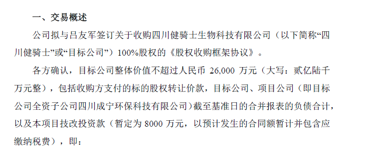《股权收购框架协议》显示,各方确认,目标公司整体价值不超过2.6亿元,包括收购方支付的标的股权转让价款,目标公司、项目公司(即目标公司全资子公司四川成宁环保科技有限公司)截至基准日的合并报表的负债合计,以及本项目技改投资款。