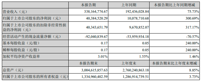 公告显示,第一季度公司营业收入3.38亿元,同比增加75.73%;归属于上市公司股东的净利润4038.45万元,同比增加300.69%;归属于上市公司股东的扣除非经常性损益的净利润4034.37万元,同比增加317.17%;基本每股收益0.17元,同比增加240%。