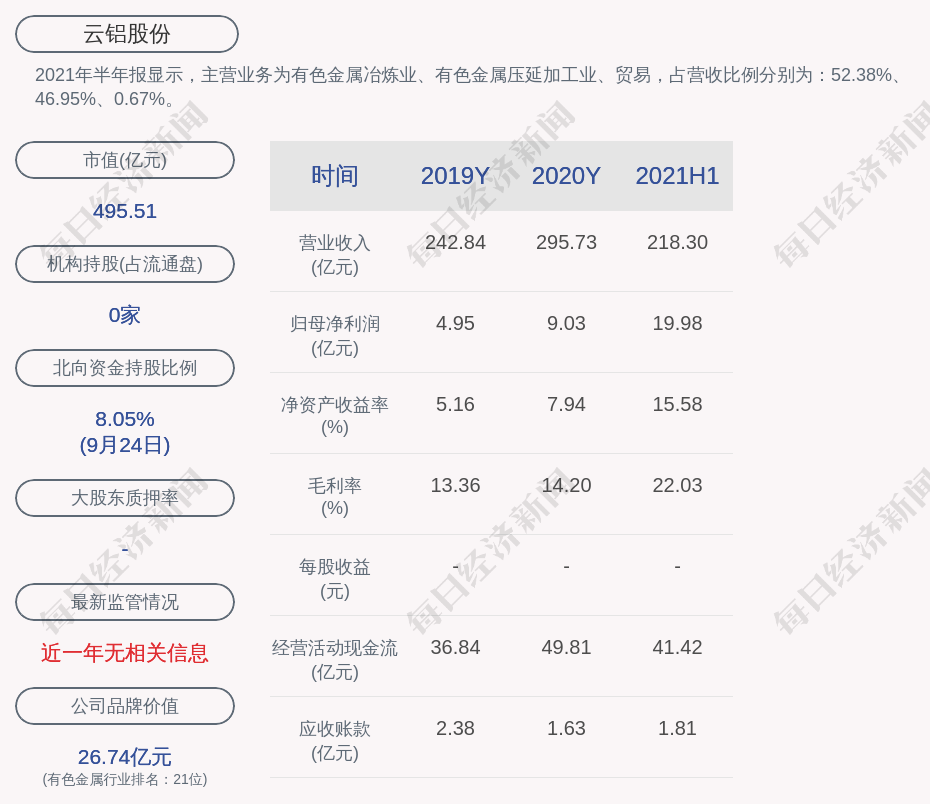 2021年半年报显示,云铝股份的主营业务为有色金属冶炼业、有色金属压延加工业、贸易,占营收比例分别为:52.38%、46.95%、0.67%。