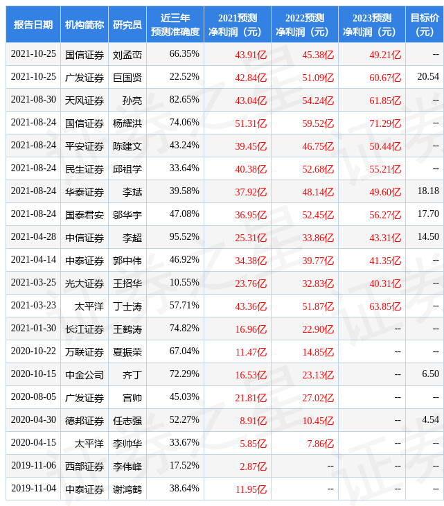 证券之星数据中心根据近三年发布的研报数据计算,中信证券(600030)李超研究员团队对该股研究较为深入,近三年预测准确度均值高达95.52%,其预测2021年度归属净利润为盈利25.31亿,根据现价换算的预测PE为17.88。