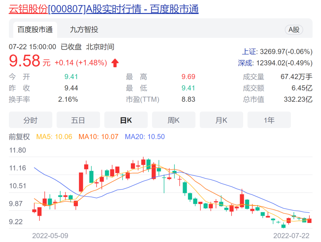 截至最新收盘日,云铝股份现价为9.58元/股,因此,此次交易价格略有溢价。